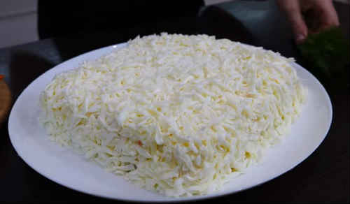 - Посипте білки сиром, розкласти рибу, і знову гарненько промажте майонезом.