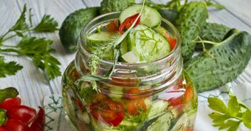 Ще одна цікава варіація зимової заготівлі салату з дивною назвою. Дуже ніжний і смачний маринад і хрусткі огірочки. Помідори привнесуть свою чарівність. Дивіться покроковий рецепт, і повторюйте дії автора. Закуска вийде – пальчики оближеш!