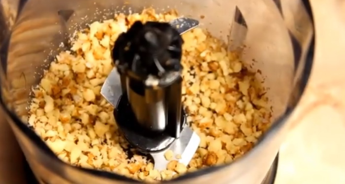 1. Яким зручним для вас способом подрібнюємо обсмажені ядра волоського горіха. Зробити це можна за допомогою блендера, ножа або файлу і скалки. Оскільки горіхи повинні відчуватися в закусці, то не рубаємо їх в дрібну крихту, а залишаємо невеликими шматочками різної величини.