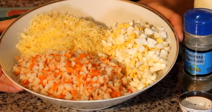 1. Крабові палички і очищені варені яйця нарізаємо дрібним кубиком і перекладаємо в чашу, де будемо готувати салат. Туди ж викладаємо сир, натертий на дрібної тертці.