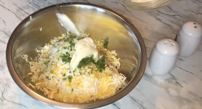 1. Для початку нам потрібно за допомогою гострого ножа подрібнити відварне філе і перекласти його в глибоку миску. Далі до м’ясних шматочках натираємо на дрібній клітинці твердий і плавлений сир, зварене круто яйце.
