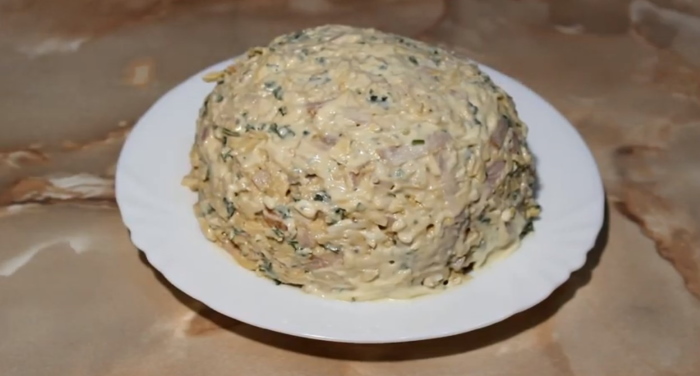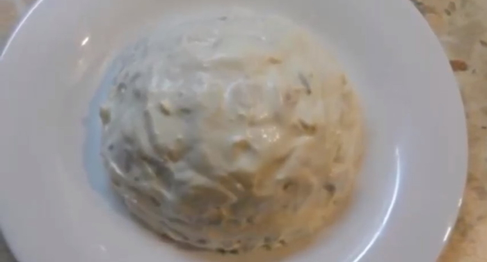7. Викладаємо отриману салатну масу на плоске блюдо, надаємо їй форму кульки, обмазуємо її майонезом.