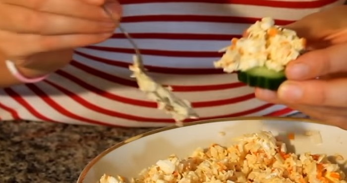 3. Салатну масу заправляємо невеликою кількістю майонезу, нам потрібно лише зв’язати інгредієнти між собою, але так, щоб вони не розтікалися. Готову закуску акуратно викладаємо півсферою на гурток огірка.