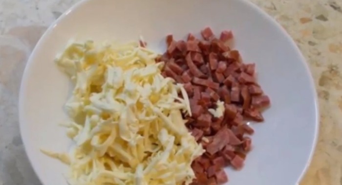 1. Плавлений сирок кладемо в морозильну камеру на 7-10 хвилин, в цей час нарізаємо ковбасу дрібним кубиком і перекладаємо в чашу. Затверділий сир натираємо і змішуємо з ковбаскою.