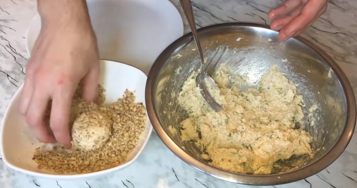 4. З отриманої суміші яєць і сиру скачуємо невеликі закусочні кульки, які обвалюють у подрібненої зелені кропу. Потім складаємо їх на блюдо, дно якого вкрите ніжними салатними листям.