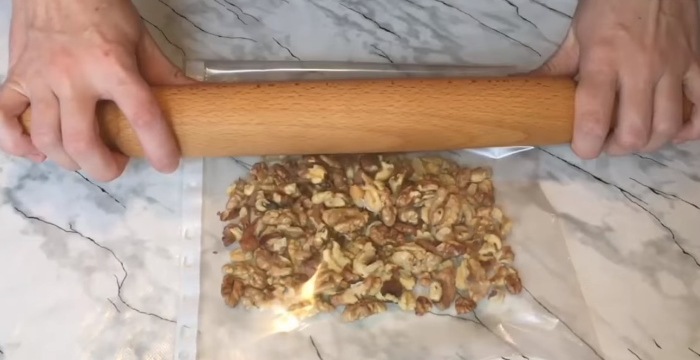 3. Тепер подрібнимо заздалегідь обсмажені на сковороді ядра волоських горіхів. Для цього візьмемо файл, пересипаємо в нього горіхи, підверніть відкритий край і за допомогою качалки отримуємо горіхову крихту.