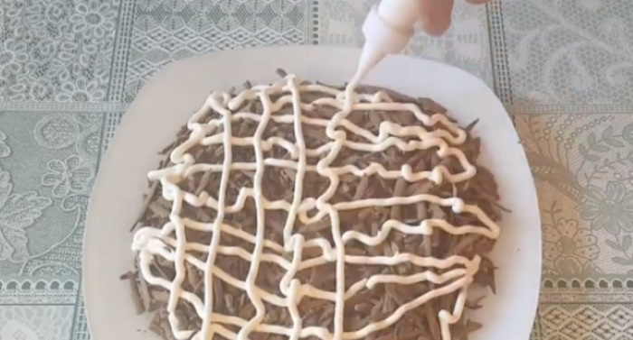 1. Печінка натираємо на крупній клітинці терки і викладаємо на плоске блюдо, сформувавши півсферу. Зверху щедро обмазуємо майонезом.