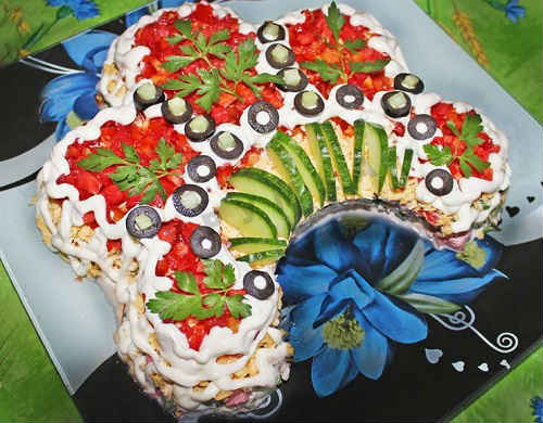 Зважитеся зробити кокошник, беріть більш вишукані продукти. Прикрасити можна чим завгодно: черрі, маринованими огірочками, оливками. Включайте фантазію і ні в чому собі не відмовляйте. Беріть червону рибу, ягідки граната, журавлини, помідори, гілочки зелені. Розташовуйте інгредієнти квіточками, завитками, кружечками, хвилями. Головне, щоб вийшло яскраво, ошатно. Задійте майонез, з його допомогою можна намалювати на красуні химерні візерунки по краях і в центрі. Я дала кілька фото, підглянете ідеї.