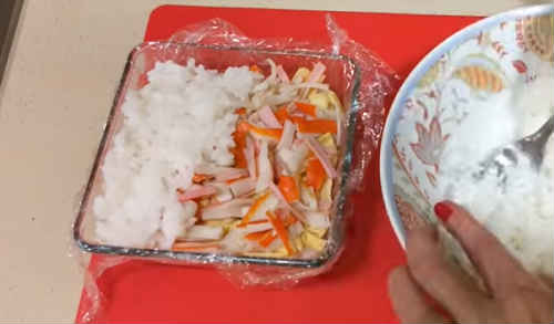 Накрийте салат плівкою, загорніть краї, трохи утрамбуйте руками вміст.