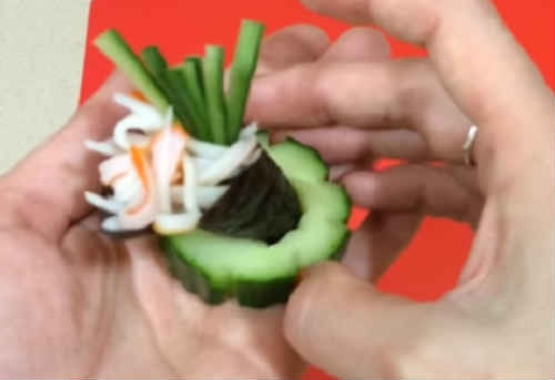 Настрогайте трохи тоненькою соломки з крабовою палички. З колечка огірка вирізати серединку, краю зробіть пелюстками квітки.