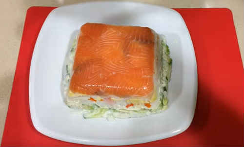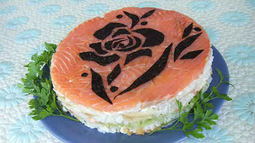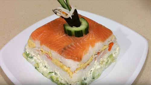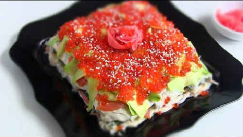 Популярний рецепт суші домашнього приготування, оскільки при всій легкості виконання, гідна прикрасити будь-який урочистий бенкет. Неймовірно смачний салат, який здатний стати «родзинкою» святкового застілля.