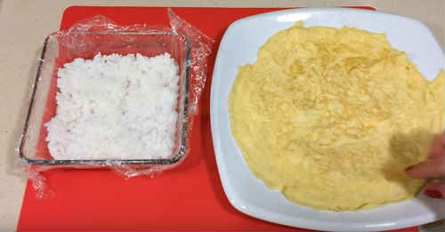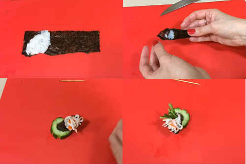 Займіться прикрасою. Відріжте частину листа норі, на край викладіть ложечку рису. Поверніть кулечком.
