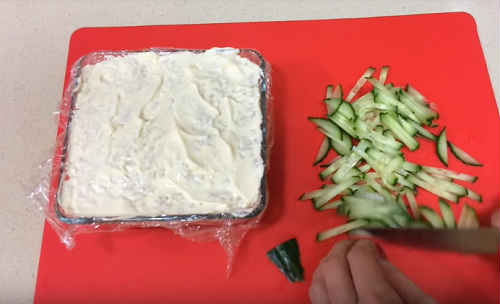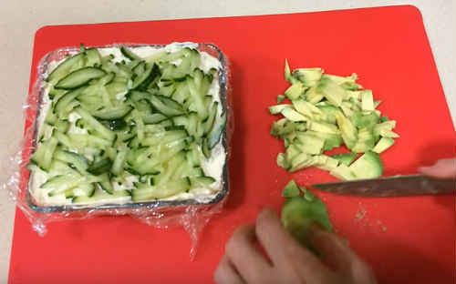 Нашаткуйте свіжий огірок тонкою соломкою. Розподіліть по майонезному шару.
