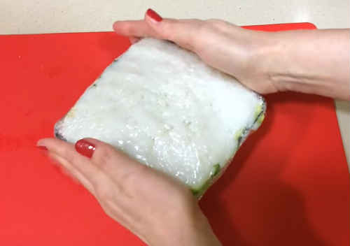 Застеліть дно салатника харчовою плівкою, оскільки готову страву ми перевернемо. Промажте плівку водою з розведеним у ній цукром, тоді при перевертанні верхній шар легко відокремиться. Можна змастити маслом.