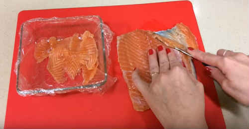 Тонкими пластинами сьомгу наріжте, покладіть першим шаром у форму.