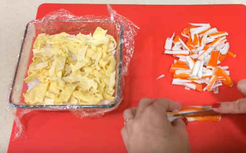 Аналогічно, соломкою поділіть крабові палички – це наступний шар страви.