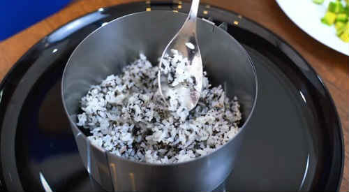 Для складання салату краще використовувати роз’ємне кулінарне кільце. Беріть невелике, 15-17 див. діаметром, і обов’язково промажте його зсередини соняшниковою олією, щоб інгредієнти не прилипали. Поставте кільце на широке блюдо, викладіть перший шар рису, змішаного з норі. Трохи утрамбуйте його ложкою або пальчиками. Але не занадто сильно, щоб рис залишився повітряним.