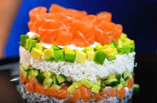 Ще одна версія ледачих суші у вигляді торта або салату, як вам більше подобається. Це ускладнена композиція суші з безлічі вдало підібраних інгредієнтів з унікальним кремом. Існує версія такого салату з куркою, яку замінюють сьомгу.