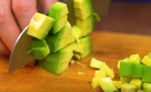- Почистіть авокадо від шкірки, вирізати кісточку, поділіть дрібними кубиками.