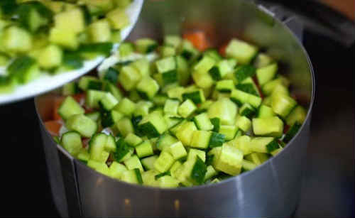 Зверху розподіліть кубики огірка.