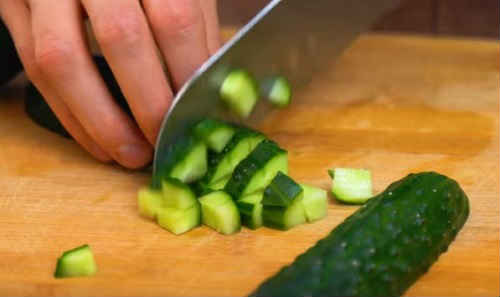 Поріжте невеликими кубиками огірки. При бажанні можете зчистити шкірку.