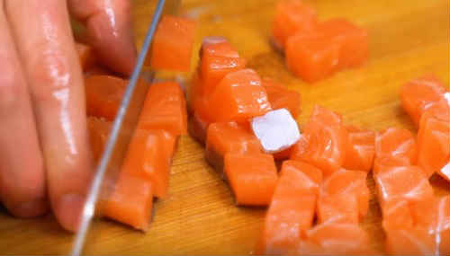 Сьомгу наріжте спочатку смужками. Відразу відкладіть 6-7 штук у бік, вони підуть на прикрасу. Інші поділіть досить великими шматочками, щоб риба відчувалася в салаті. Втім, це не обов’язково, можете зробити кубики більш дрібними.