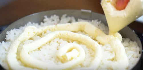 Далі необхідно викладіть залишився рис, без норі. Знову трохи утрамбуйте шари. Покрийте м’яким сиром, розрівняйте.