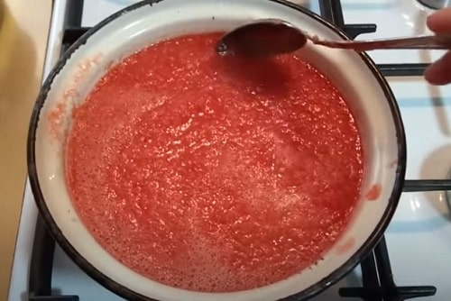 Поставте ємність з томатною заливкою на плиту. Відразу засипте сіль з цукром. Спробуйте на смак і подкорректируйте кількість солі. Дайте закипіти на помірному вогні. Сбавьте потужність до мінімуму. Варіть при тихому кипінні протягом 7-10 хвилин.