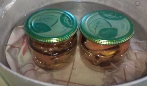 Для надійності баночки з салатом можна стерилізувати, хоча тож варто відмінно навіть в квартирних умовах і не вибухає. Щоб це зробити, поставте наповнені скляні ємності в широку каструлю з гарячою водою. Обробляйте після закипання протягом 15-20 хвилин. Але тоді закочувати потрібно тільки після стерилізації.