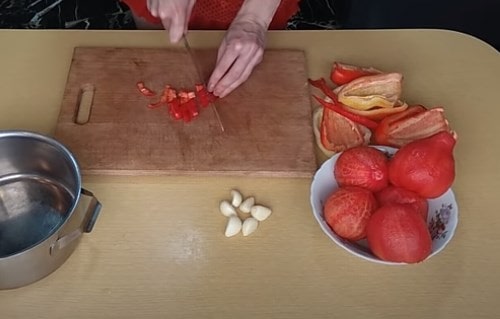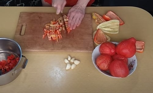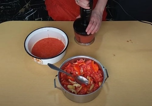 - Складіть часник, обидва види перцю, помідори в окрему посудину, за допомогою блендера перетворите в пюре. відправте в каструлю з синенькими.