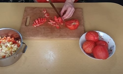 Обдайте помідори окропом, швидко перекладіть в крижану воду. Сдерніте шкірку. Потім порубати кубиками.