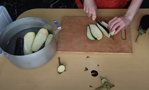 Помийте овочі, зріжте кінчики. Настругати слайсами, не дуже товстими, досить 5-7 мм. Залийте холодною водою, залиште на 30-40 хвилин, щоб пішла гіркота. Якщо у вас сорт без гіркоти, дану маніпуляцію пропустіть.