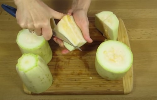 Підготуйте в переробці кабачки. Великі екземпляри поділіть на частини, розрізавши поперек. Виріжте насінну частину.