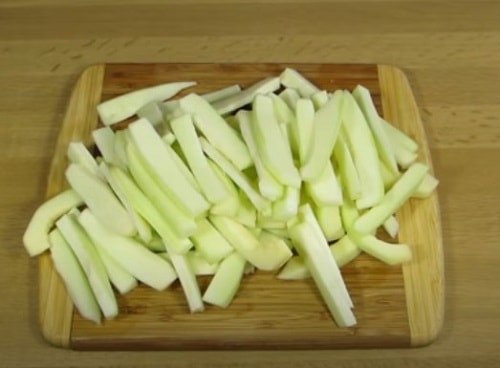 Наріжте слайсами – тонкими смужками. Молоденькі овочі можна не чистити, а відразу нарізати мовами.