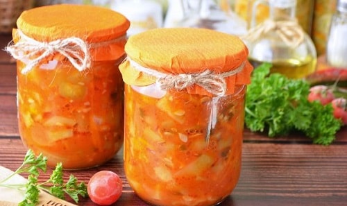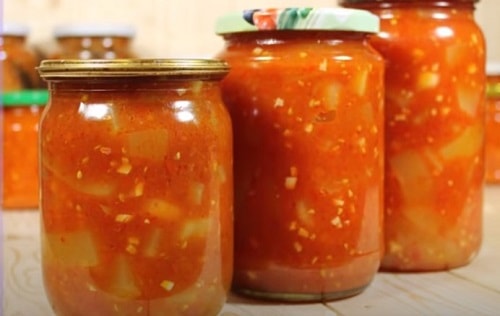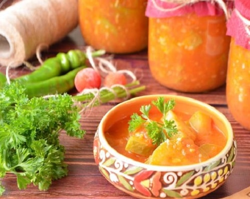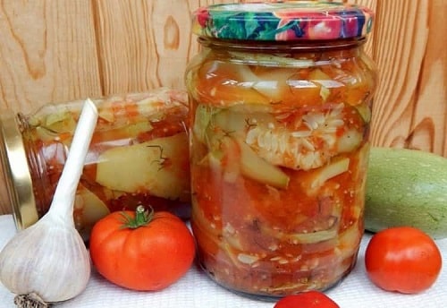 Для консервування бажано брати молоді кабачки з тонкою шкіркою і з несформировавшейся насіннєвий частиною. Закуска гарна до м’яса, рибі, картопельки, або просто з шматочком хлібця. Основні овочі – кабачки, помідори, часник. Але звиклі до експериментів наші господині давно вдосконалили рецепти. Кладуть різні сорти перцю, морква, навіть яблука. При варінні завжди дотримуйтесь точний час приготування, щоб язички кабачка не розварилися, зберігши форму.