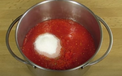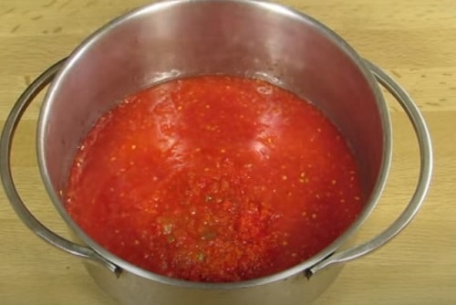 - Складіть помідорне пюре в каструлю, дайте закипіти, варіть на малому вогні 10 хвилин.