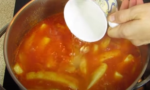 За пару хвилин до готовності влийте оцет. Закрийте каструлю кришкою, дайте бурхливо закипіти, вимкніть конфорку.