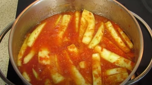 - Дочекайтеся закипання салату. Зніміть з конфорки, додайте кабачки. Перемішайте закуску. Залиште настоюватися на 2 години.