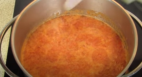 - Після закінчення заданого часу поверніть каструлю на плиту. Відразу покладіть томатну пасту. Коли тещин язик закипить, варити 40 хвилин, зробивши вогонь на мінімум.