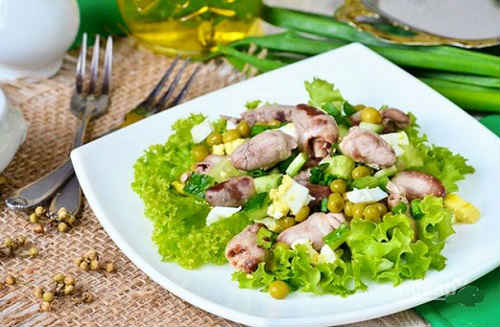 Смачний салат з курячої печінки, сердечок, солоних огірків, зеленого горошку
