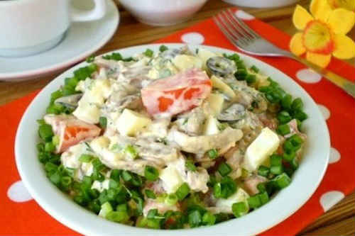 Дуже популярний рецепт салату, призначеного для святкового частування. Маринований огірочок сміливо можна замінити свіжим, тоді смак буде більш ніжним. Якщо готуєте страву до свята, зробіть його шарами. Для повсякденного трапези дозволяється просто перемішати складові.