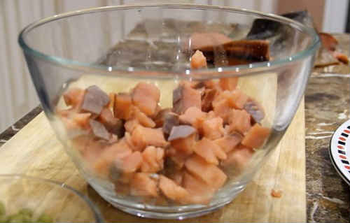 - Червону рибу наріжте маленькими кубиками.