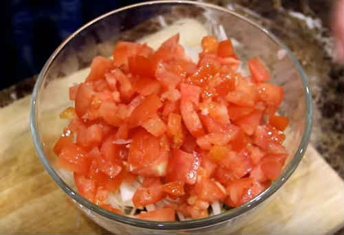 Поділіть помідори кубиками, злийте зайву рідину, інакше з-за великої кількості рідини блюдо попливе. Розкладіть наступним шаром. Шар знову промажте соусом.