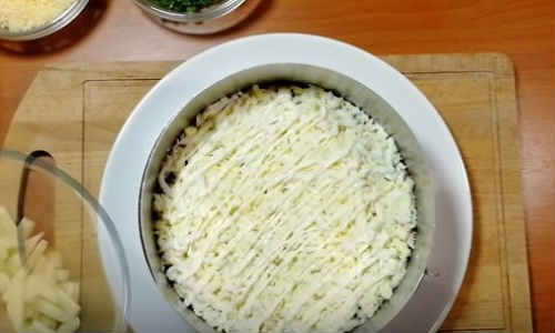 Накрийте шаром з потертого великої стружкою яйця, тут можна додати трохи більше майонезу.