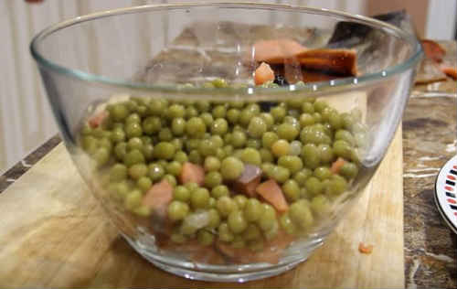 Злийте з банки з горошком консервант, перекладіть до риби.