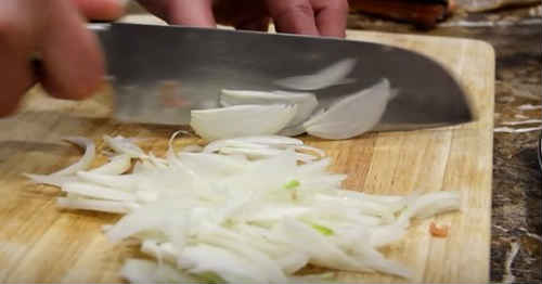 Наріжте цибулину пір’ям, відправте слідом.
