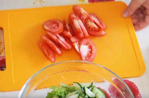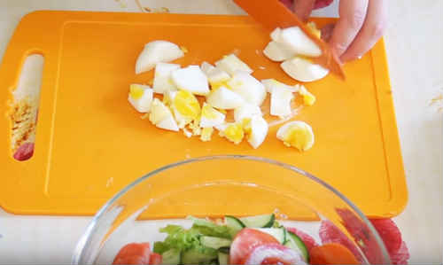 Завчасно відваріть круто яйця. Крупно поріжте, аналогічно овочів.