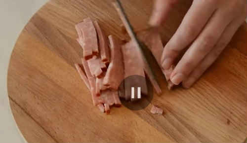 - Всі м’ясні продукти наріжте тонкою соломкою, довжиною 2,5 сантиметра. Якщо окіст занадто жирний, зріжте трохи сала.