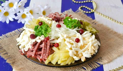 «Мисливський салат» — рецепт з копченою ковбасою і солоними огірками