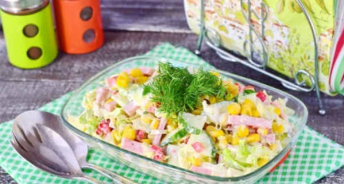 Готуйте салати не тільки з огірком, кладіть свіжу капусту, використовуйте пекінський її сорт. Чудові закуски виходять з кукурудзою і зеленим горошком, свіжою морквиною або маринованої по-корейськи. Тримайте добірку з кращих ідей страви на будь-який смак.
